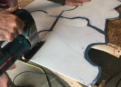 Puzzle shapes were painted on a 4'X5' sheet of MDO board. MDO board is a masonite laminate that when primed on both sides and edges can be used in outdoor installations. Using a jigsaw the pieces were cut, sanded and primed.