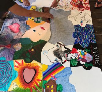 The Puzzle Project was designed in a retreat format for homeless and transitionally housed women. The women met on a Saturday at The Living Room, a day service campus providing support for women and children experiencing housing insecurity. The project was developed to reinforce that each unique person and puzzle piece matters and has a place in the whole puzzle. Essentially, the completed Puzzle Project can be hung on all sides rendering four ways of hanging the puzzle. The viewer can have different perspectives to the whole Puzzle Project.